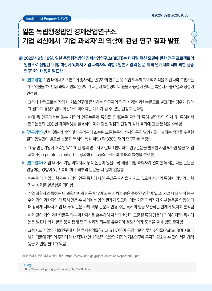 | 일본 독립행정법인 경제산업연구소, 기업 혁신에서 ‘기업 과학자’의 역할에 관한 연구 결과 발표 |