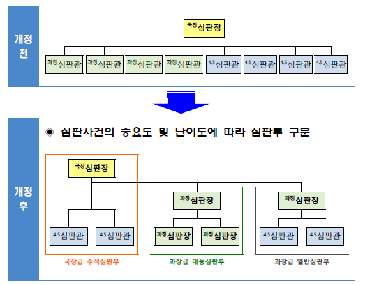 - (주요내용) 기존 11개 심판부에서 36개 심판부 체제로 개편하고, 심판장 1인과 심판관 2인으로 구성된 3인 합의체를 전면 실시함