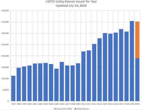 ● 2020년 7월 14일, 미국 특허전문 블로그 Patently-O는 1997년부터 2019년까지 미국 내 발명특허등록(USPTO Utility Patent Issued)에 대한 추이를 분석하고 2020년 특허등록 예측 결과를 발표함