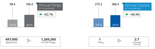 - (주요내용) 동 보고서는 지난 10년간 유럽상표가 놀라운 성장을 이루었다고 평가함∙ (출원 건수) 2019년 기준으로 3만 4천개 이상의 상품과 서비스에 대해 약 1만 2,700개의 상표가 출원되었고, 이는 연평균 5.6%의 성장률을 기록한 것이며, 2010년에 비하여 63.1%가 증대됨