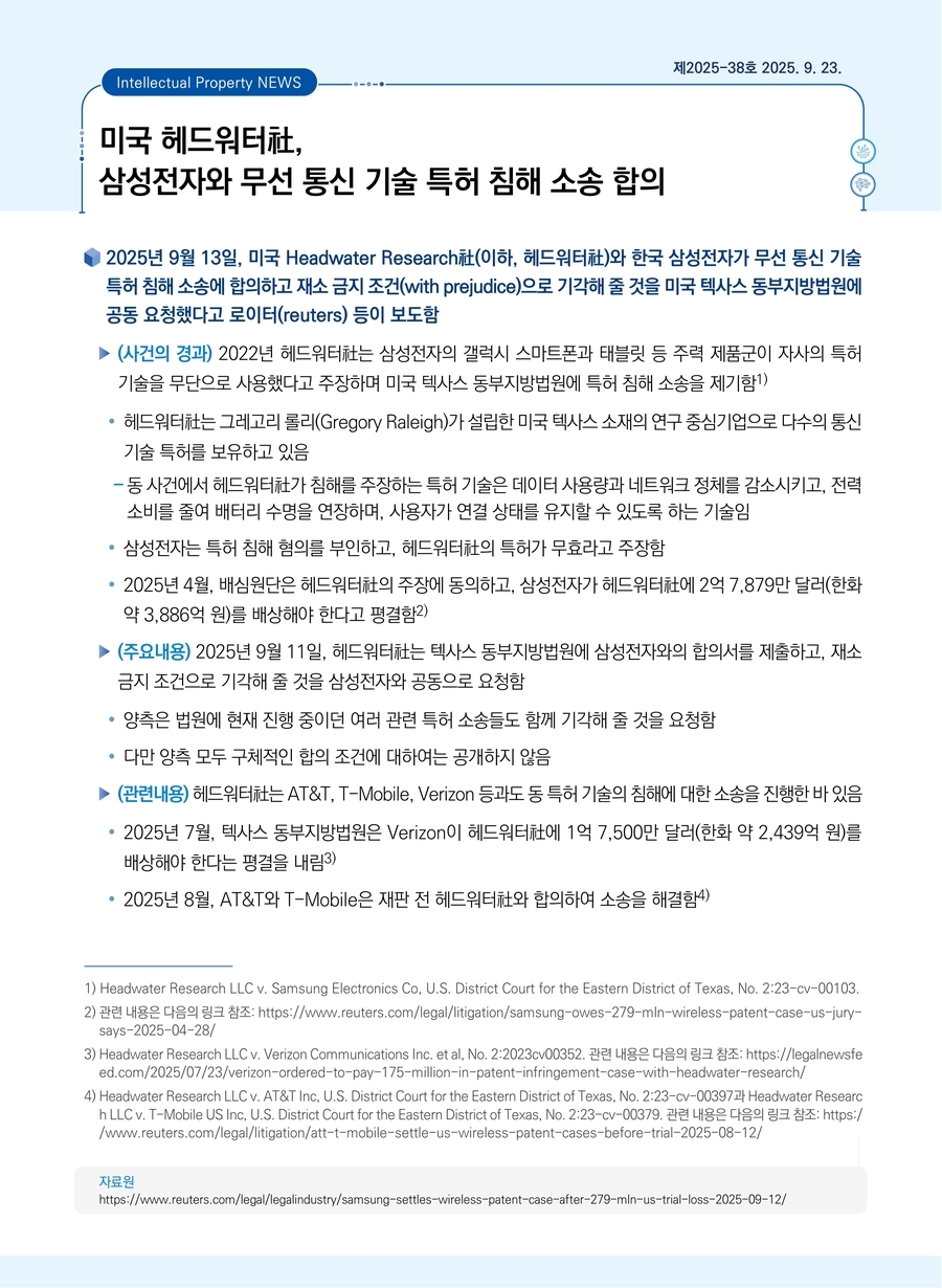 미국 헤드워터社, 삼성전자와 무선 통신 기술 특허 침해 소송 합의