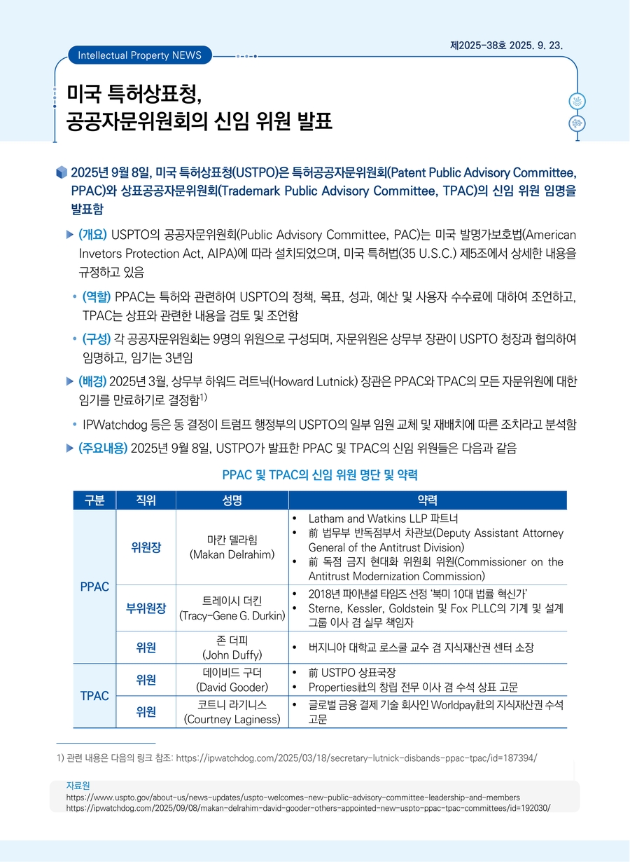 미국 특허상표청, 공공자문위원회의 신임 위원 발표