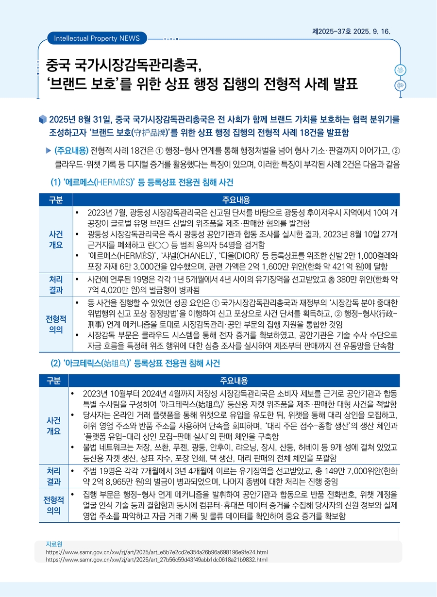 중국 국가시장감독관리총국, ‘브랜드 보호’를 위한 상표 행정 집행의 전형적 사례 발표