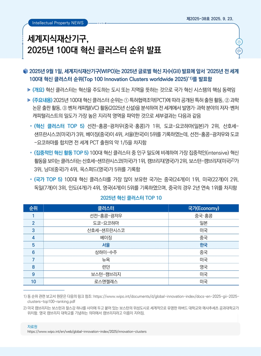세계지식재산기구, 2025년 100대 혁신 클러스터 순위 발표