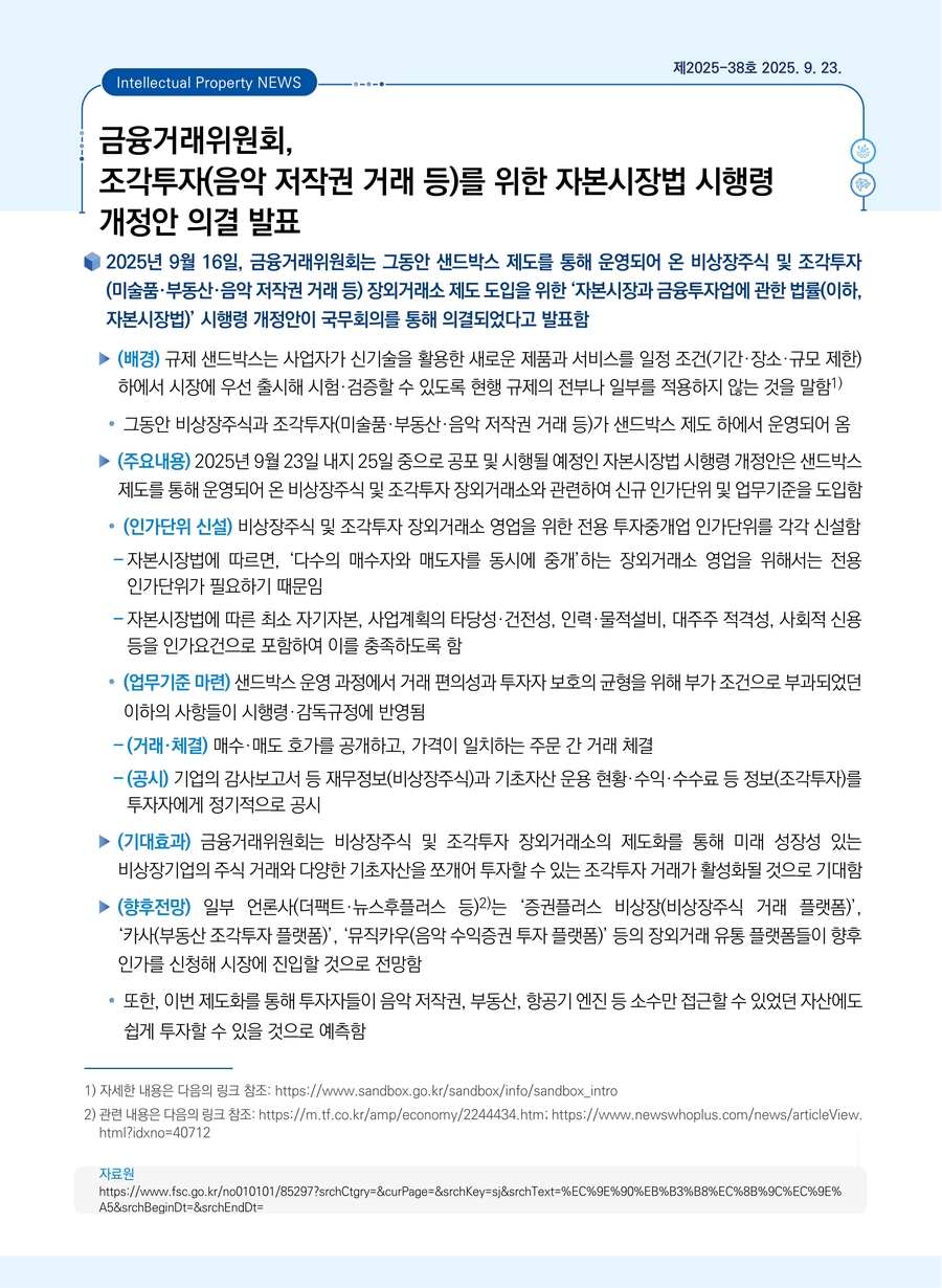 금융거래위원회, 조각투자(음악 저작권 거래 등)를 위한 자본시장법 시행령 개정안 의결 발표