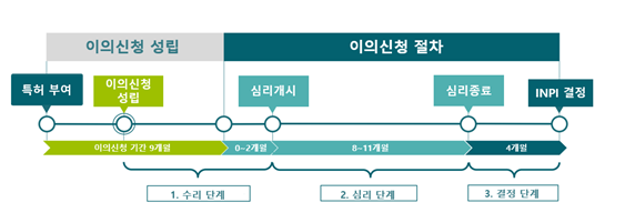 -(배경) 프랑스는 2020년 4월 1일 ‘기업성장 및 전환을 위한 행동계획 법안(이하, PACTE법)’을 발효함1) ∙ 프랑스에서는 특허심판제도가 없으며, 특허침해소송에서 피고가 항변 사유로 무효를 주장함 -(주요내용) PACTE법상 특허 무효 등에 관한 소송절차를 간소화하기 위해 특허심판제도를 신설하고 중소기업 및 스타트업·벤처기업 등의 지식재산권에 대한 접근을 촉진함 ∙ 특허심판청구는 특허권 공개 후 9개월 이내 INPI 홈페이지에 신청을 완료해야 함 ∙ INPI는 이의신청 접수 후 이의신청 가능성(la recevabilité de l’opposition)을 심리함 ∙ 당사자 간 서면 의견 교환이 이루어지는 동안 기술조사관 2명으로 구성된 INPI 위원회는 심리단계에서 구두변론을 개최하고 이의신청 대한 결론을 지을 수 있음 ∙ INPI의 조사단계가 끝난 시점부터 4개월간 최종심리단계에 진입하여 최종 결론을 도출함 ∙ 결정문은 당사자에 통지되며, 특허 전체 또는 일부 무효, 정정(modifiée), 유지(maintien) 결정의 통지가 발송됨 ∙ INPI 결정에 대해서는 파리항소법원에 항소할 수 있음 ∙ 이의신청 절차를 진행하는 비용은 600 유로(한화 약 79만원)임