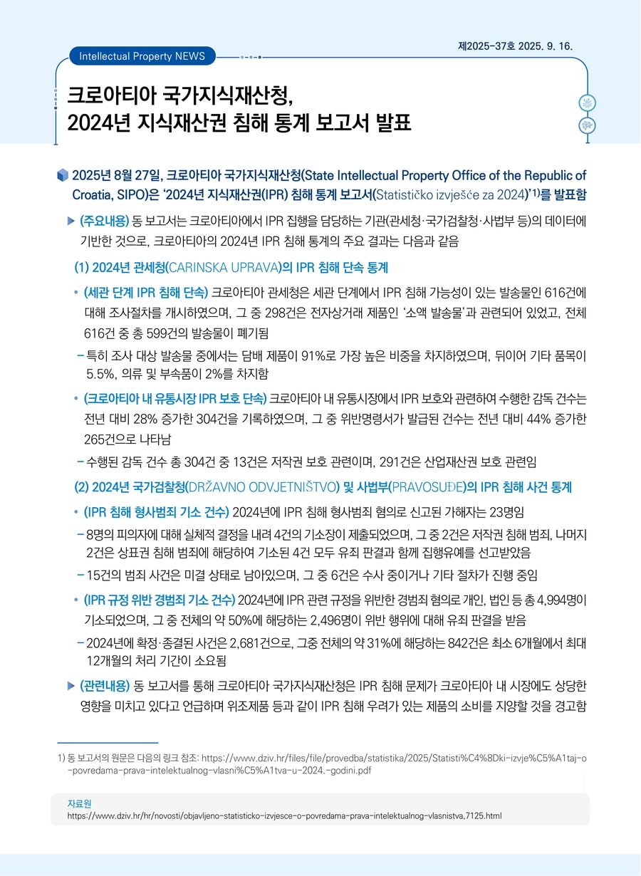 크로아티아 국가지식재산청, 2024년 지식재산권 침해 통계 보고서 발표