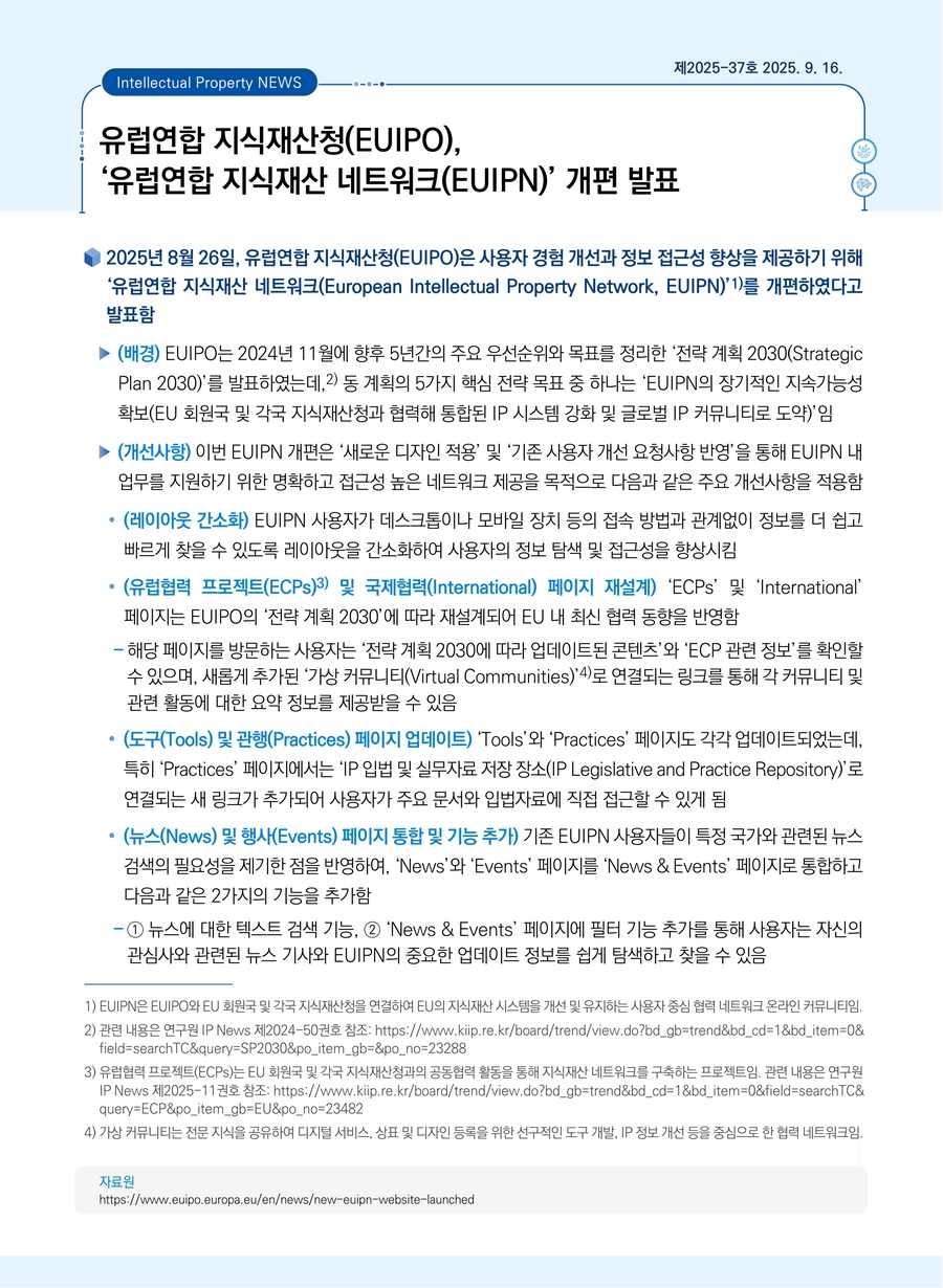 | 유럽연합 지식재산청(EUIPO), ‘유럽연합 지식재산 네트워크(EUIPN)’ 개편 발표 |