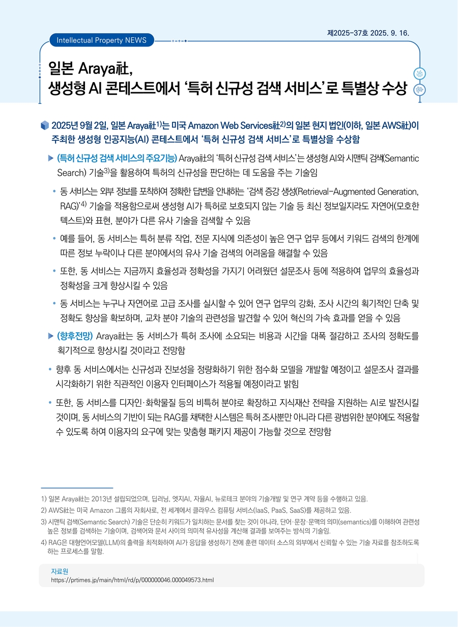 일본 Araya社, 생성형 AI 콘테스트에서 ‘특허 신규성 검색 서비스’로 특별상 수상