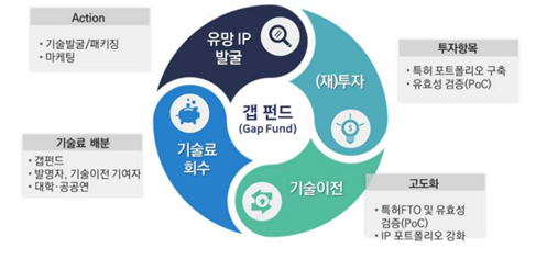 -(배경) 특허 갭펀드는 대학과 공공연구기관이 보유한 특허와 기업이 원하는 기술간의 수준 차이(gap)를 해소하기 위해 특허검증, 시제품 제작, 기술 마케팅 등 기술 상용화를 지원하는 사업임 ∙ 이전의 일회성 지원 사업과 달리 마치 펀드처럼 기술 이전을 통해 기술료를 회수하고 이를 다른 유망 특허기술에 재투자하는 방식으로 지속가능하게 운영됨 -(목적) 정부지원 종료 후에도 대학⋅공공연구기관이 스스로 특허사업화를 수행하는 선순환 특허 생태계 구축을 목표로 함 -(주요내용) 특허 갭펀드 지원사업 심사 결과 서울대, 재료연구소, ㈜엔포유 대학연합 기술지주회사가 선정됨 ∙ 특허청은 선정된 기관들이 특허 갭펀드를 조성하도록 앞으로 3년간 매년 2~4억 원의 기술상용화 자금을 지원함 ∙ 사업기간은 총 9년이며, 3년간의 1차지원금 대비 80% 이상을 회수⋅재투자한 기관에 한하여 2차 지원을 할 예정임 -(관련내용) 지난해 특허 갭펀드 사업을 처음으로 실시하여 6개 대학과 공공연구기관2)에 총 18억 원의 자금을 지원한 바 있으며, 운영 결과 특허 이전 59건 및 로열티 78.7억 원의 성과를 창출했고 지원 첫해에 지원금의 절반에 해당하는 47%의 기술료를 회수함
