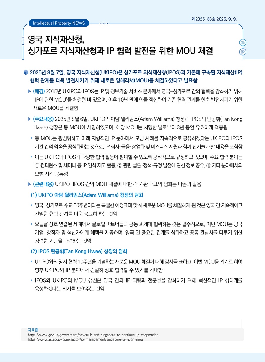영국 지식재산청, 싱가포르 지식재산청과 IP 협력 발전을 위한 MOU 체결