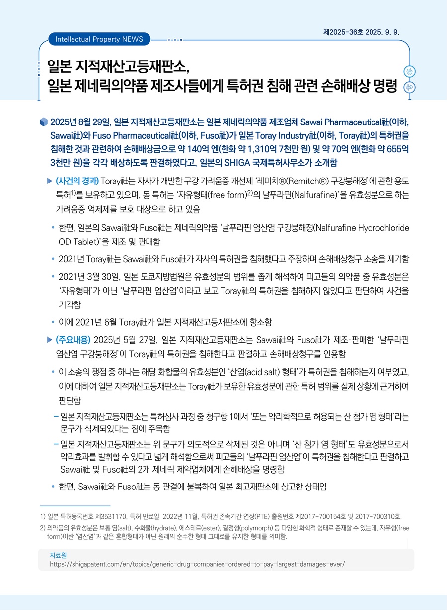 일본 지적재산고등재판소, 일본 제네릭의약품 제조사들에게 특허권 침해 관련 손해배상 명령