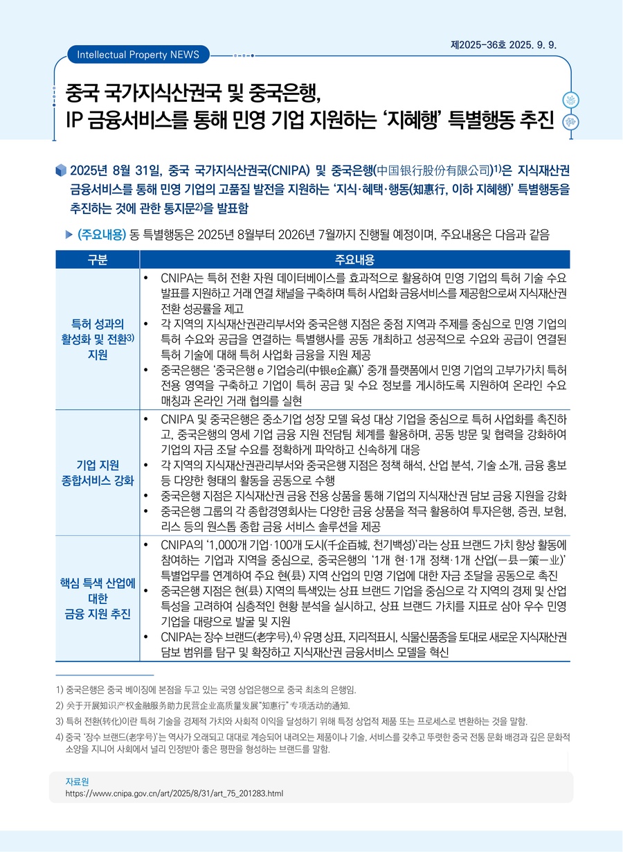 | 중국 국가지식산권국 및 중국은행, IP 금융서비스를 통해 민영 기업 지원하는 ‘지혜행’ 특별행동 추진 |