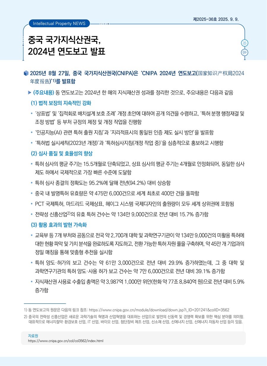 중국 국가지식산권국, 2024년 연도보고 발표