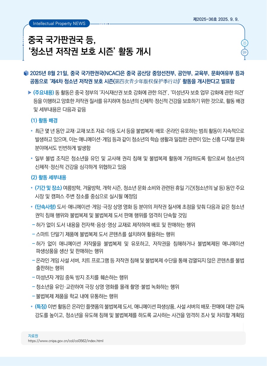 중국 국가판권국 등, ‘청소년 저작권 보호 시즌’ 활동 개시