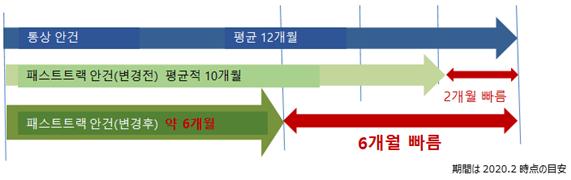 - (배경) JPO는 2018년 10월부터 상표심사에 있어서 패스트트랙 심사를 운용하여 통상보다 약 2개월 정도 빠른 심사(1차 심사통지)를 실시하고 있음1) ∙ 이번 패스트트랙 심사 운용의 변경을 통해 이용자가 사업 계획을 세움에 있어 상표권과 관련한 사항을 더욱 편리하고 용이하게 하고자 함 - (주요내용) 이번 심사운용의 변경으로 상표에 대한 심사기간은 출원으로부터 약 6개월 정도 소요될 것으로 예상되며 패스트트랙 심사의 대상 안건이 증가함으로써 전체적으로 심사처리의 촉진이 기대됨 ∙ 통상적으로 안건과 관련된 1차 심사통지까지의 기간은 평균 12개월 정도이므로 약 6개월 이상 빨리 심사를 받게 됨 ∙ 대상 안건은 ➀ 출원시 「유사 상품·서비스 심사 기준」, 「상표법 시행 규칙」 또는 「상품 · 서비스 국제 분류 표(니스 분류)」에 게재된 상품·서비스만을 지정한 상표출원, ➁ 심사 착수 시까지 지정 상품·지정 서비스의 보정을 하지 않은 상표출원으로 기존의 운용 대상과 동일 ∙ 이번 새로운 운용 변경은 2020년 2월부터 출원된 건을 대상으로 실시할 예정임