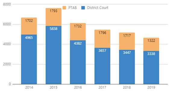 • 2020년 1월 1일, Unified Patent社1)는 ‘2019년도 특허분쟁보고서(2019 Patent Dispute Report – Year in Review)’를 발표함 - (배경) Unified Patent社는 매년 지방법원(District Court) 및 특허심판원(PTAB)에서 제기된 특허소송 및 심판을 파악하여 특허분쟁 동향을 발표함 - (주요내용) 2019년 특허분쟁 소송 건수는 전체적으로 약간 감소한 반면 특허심판원 심판이 크게 줄었음에도 불구하고 특허비실시기업(NPE)과 관련된 특허소송건수는 2018년에 비해 4% 증가함 ∙ 특허심판절차(IPR, CBM, PGR)는 2018년도와 비교하여 23% 감소하였으며, 한편 2019년도 IPR 심판 청구의 62%가 개시되어 개시율(institution rate)은 일정하게 유지됨 ∙ 지방법원의 특허소송은 2018년에 비해 3% 감소하였으나, 2019년 NPE에 의해 총 1,944건의 소송이 제기되었으며 이는 2018년도보다 약간 증가한 수치임 ∙ 델라웨어 지방법원은 NPE의 64%가 침해소송을 제기하는 법원으로 동 법원의 특허소송은 2018년에 비해 16% 증가함 ∙ 소송 및 심판청구 기술 분야는 대부분 소프트웨어, 하드웨어 및 네트워킹과 관련한 첨단 기술 산업과 관련된 것으로 지방법원의 경우 전체 소송의 59.3%, PTAB의 경우 60.4%를 차지함