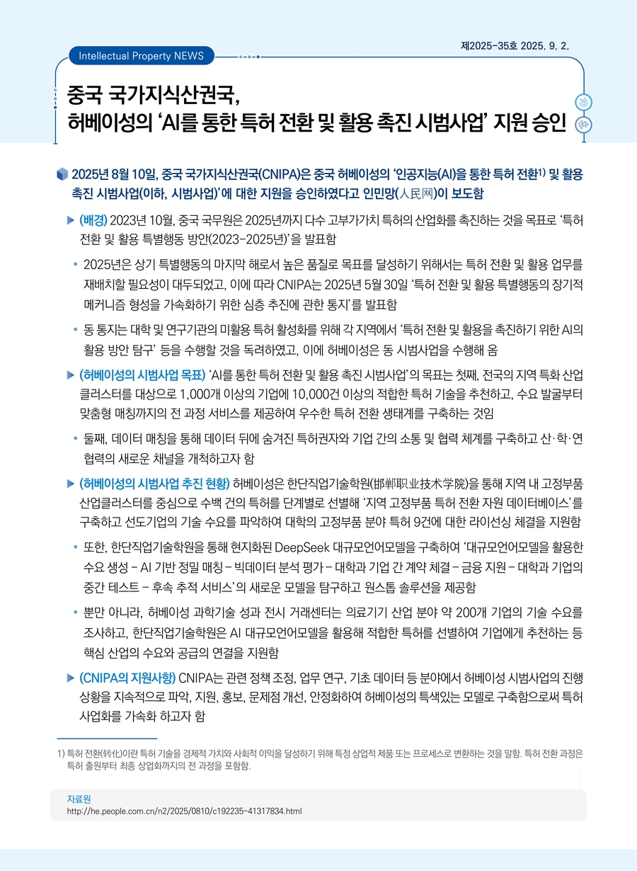 중국 국가지식산권국, 허베이성의 ‘AI를 통한 특허 전환 및 활용 촉진 시범사업’ 지원 승인