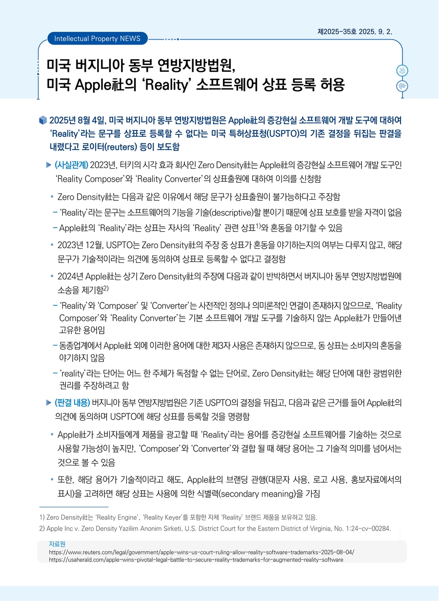 | 미국 버지니아 동부 연방지방법원, 미국 Apple社의 ‘Reality’ 소프트웨어 상표 등록 허용 |