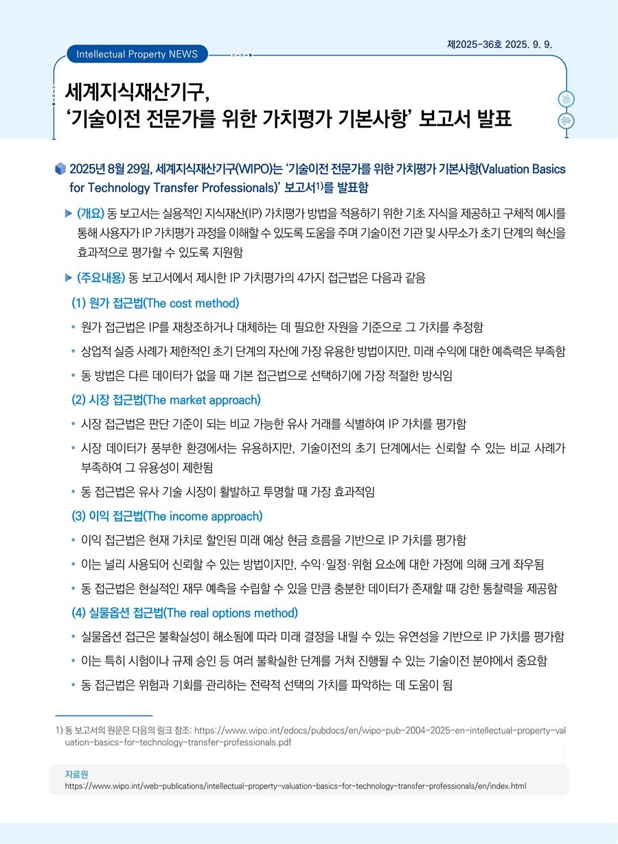 세계지식재산기구, ‘기술이전 전문가를 위한 가치평가 기본사항’ 보고서 발표