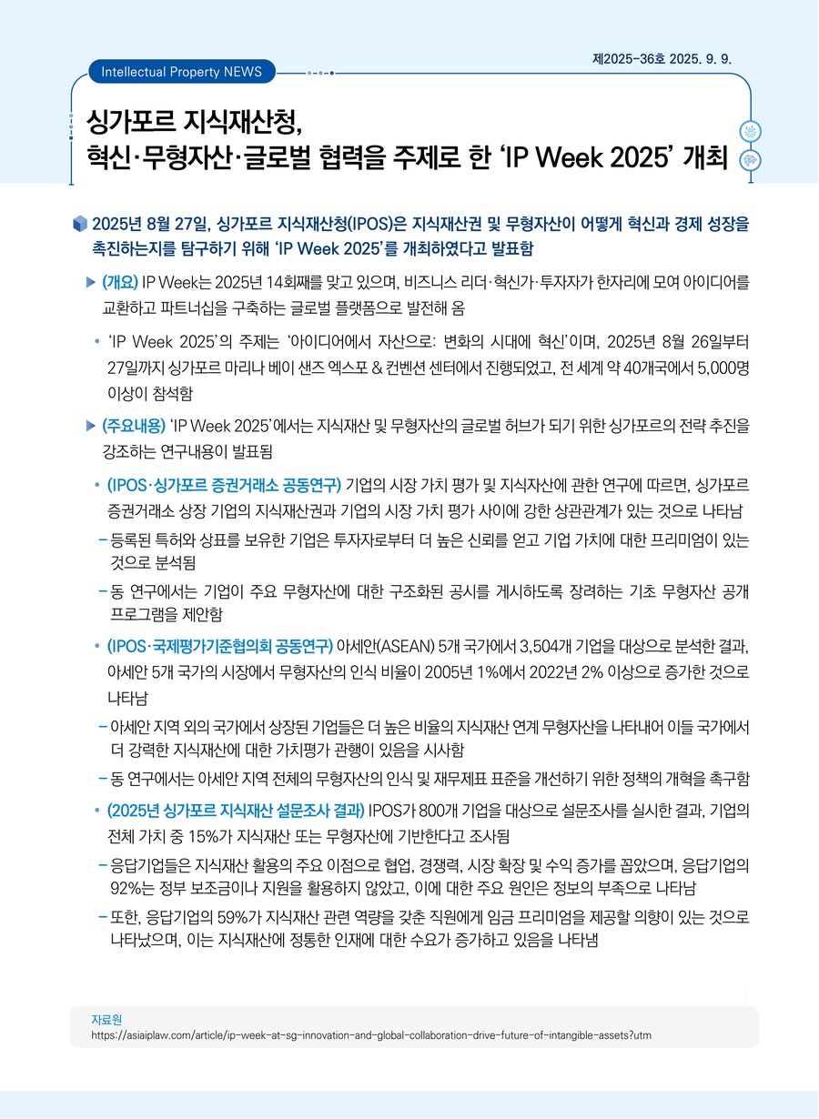 싱가포르 지식재산청, 혁신·무형자산·글로벌 협력을 주제로 한 ‘IP Week 2025’ 개최