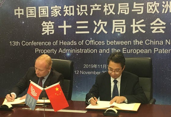 • 2019년 11월 12일, 중국 국가지식산권국(CNIPA)은 제13차 중국-유럽 특허청장회의(中欧第十三次局长会议)를 쑤저우시(苏州市)에서 개최하고 유럽특허청(EPO)과 특허협력조약(PCT) 협력 강화에 합의함