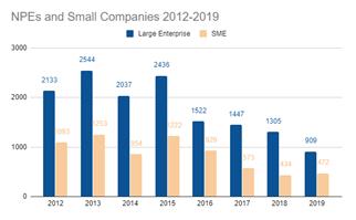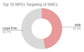 - (개요) Unified Patent社는 자사의 포괄적 특허소송 및 NPE 데이터베이스를 사용하여 미국 특허법(AIA)의 제정 이후 제기된 3만 8천 건 이상의 지방법원 사례를 평가하여 중소기업(수익 2억 달러 미만, 직원 수 200명 이하)을 대상으로 한 소송을 분석함 - (주요내용) 분석 결과에 따르면 NPE는 개인 특허권자보다 중소기업(SME)을 대상으로 더 많은 소송을 실시하는 경향을 나타내고 있음을 파악하였으며 주요 결과는 다음과 같음 ∙ 전반적인 NPE 소송이 감소하고 있음에도 불구하고 중소기업을 대상으로 한 소송 비율이 일정하게 유지되고 있으며 또한 처음부터 중소기업을 겨냥한 소송을 실시하고 있음을 확인함
