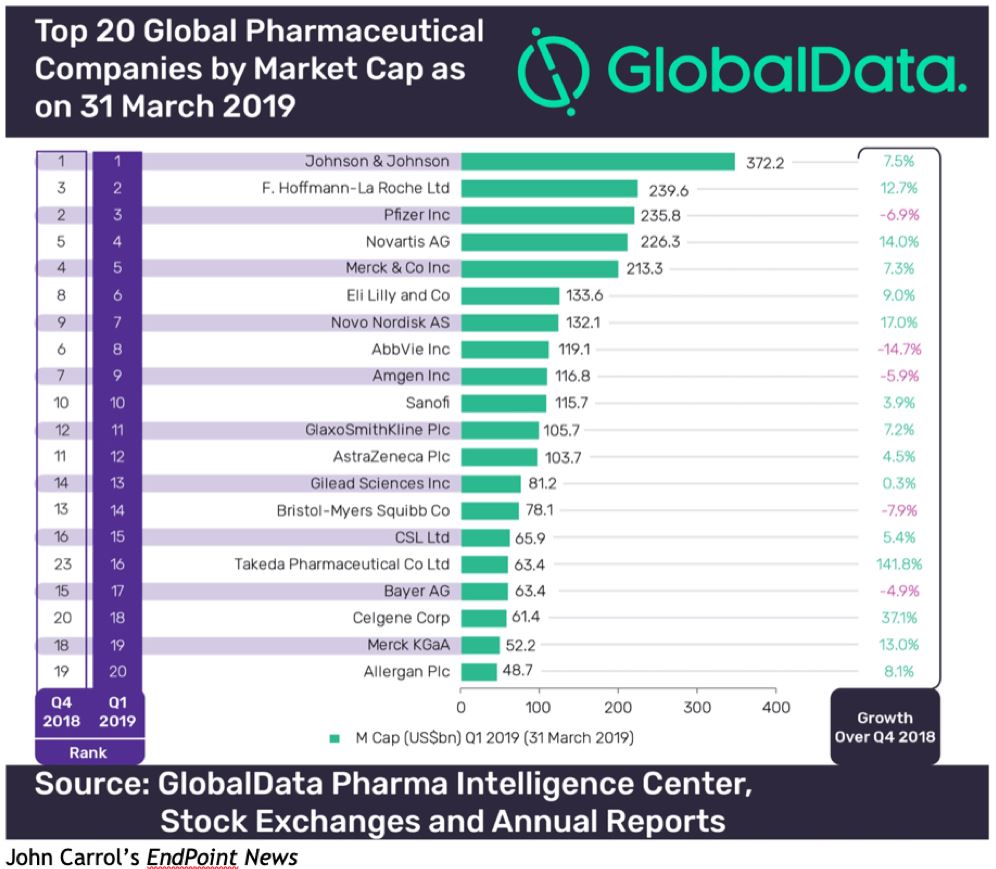 - (배경) GlobalData는 1999년 설립된 데이터 분석 및 컨설팅 기업으로 항공, 자동차, 과학기술, 의료 기기, 제약 등 다양한 산업 분야의 고유한 데이터를 바탕으로 한 전문가 분석, 솔루션을 제공함 - (주요내용) GlobalData가 발표한 2019년 제1분기(3월 31일) 기준, 시가 총액 상위 20개 제약사 순위는 다음의 그림과 같음 ∙ 주목할 만한 성장을 이룬 기업으로 Takeda社가 Shire社를 인수하여 142% 증가하였으며 그 밖에 Celgene社가 37% 성장, Novo Nordisk社가 17%, Novartis社가 14% 성장을 기록함 ∙ 한편 Bristol Myers Squibb社 -7.9%, Pfizer –6.9%, Bayer社 -4.9% 등이 2018년 4분기에 비교하여 시가 총액이 감소함