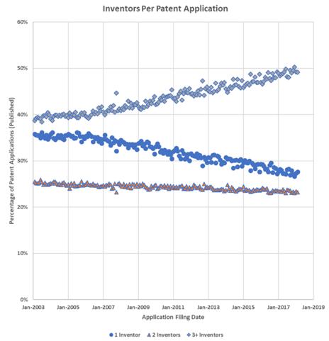 • 2019년 11월 8일, 미국 특허전문 블로그 Patently-O는 2003년 1월부터 2019년 1월까지 미국 내 특허출원 당 발명가 인원수에 대한 추이를 분석하여 보도함
