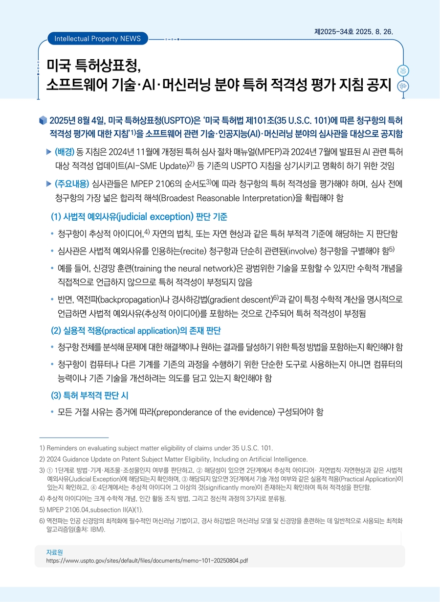| 미국 특허상표청, 소프트웨어 기술·AI·머신러닝 분야 특허 적격성 평가 지침 공지 |