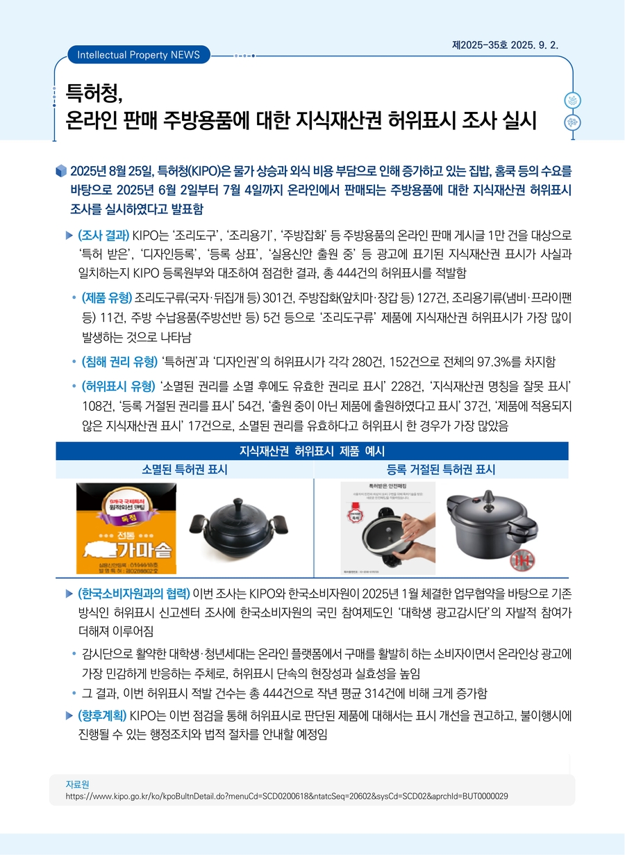 특허청, 온라인 판매 주방용품에 대한 지식재산권 허위표시 조사 실시