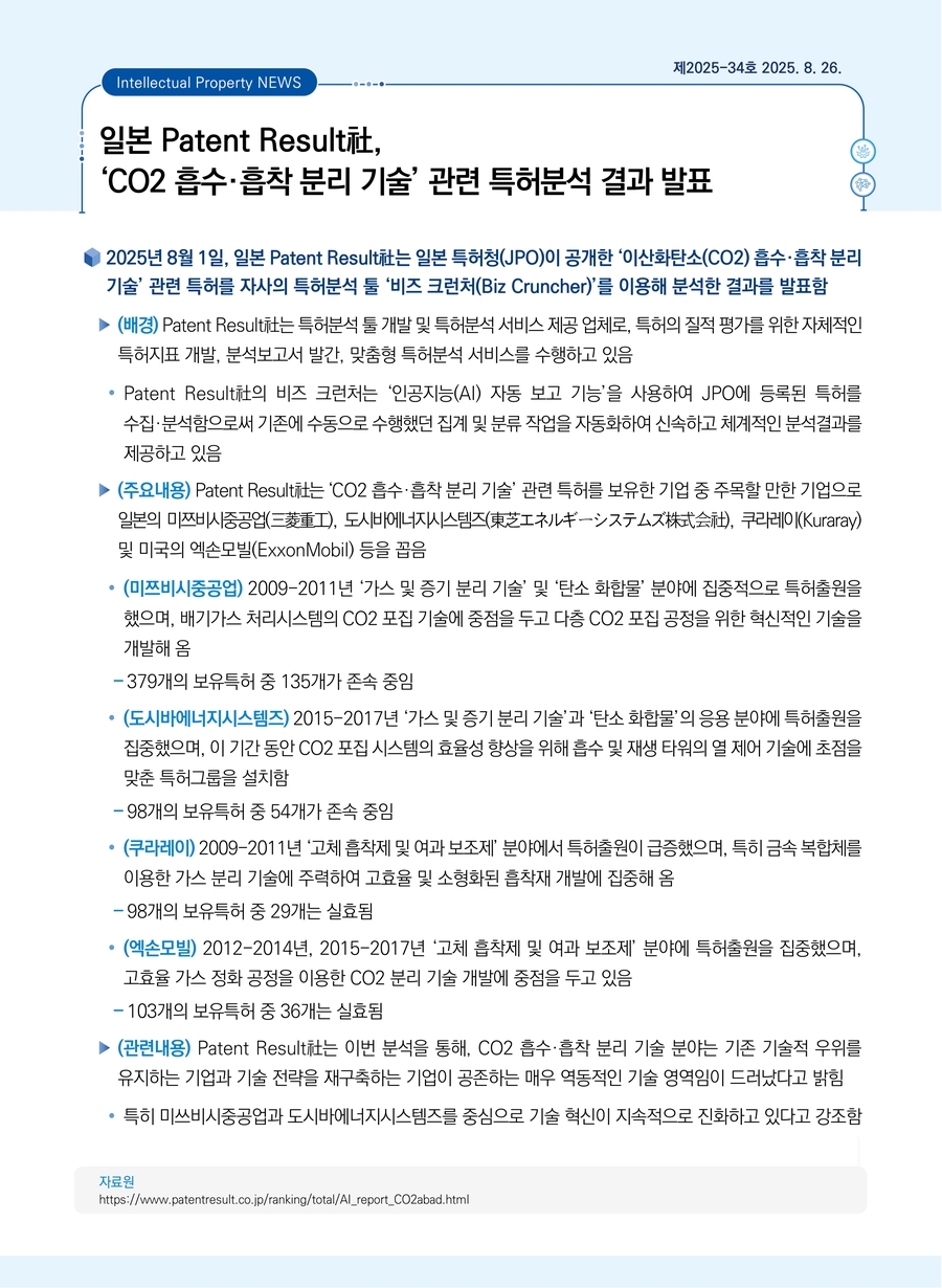 | 일본 Patent Result社, ‘CO2 흡수·흡착 분리 기술’ 관련 특허분석 결과 발표 |