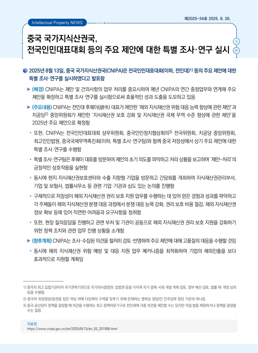 | 중국 국가지식산권국, 전국인민대표대회 등의 주요 제안에 대한 특별 조사·연구 실시 |