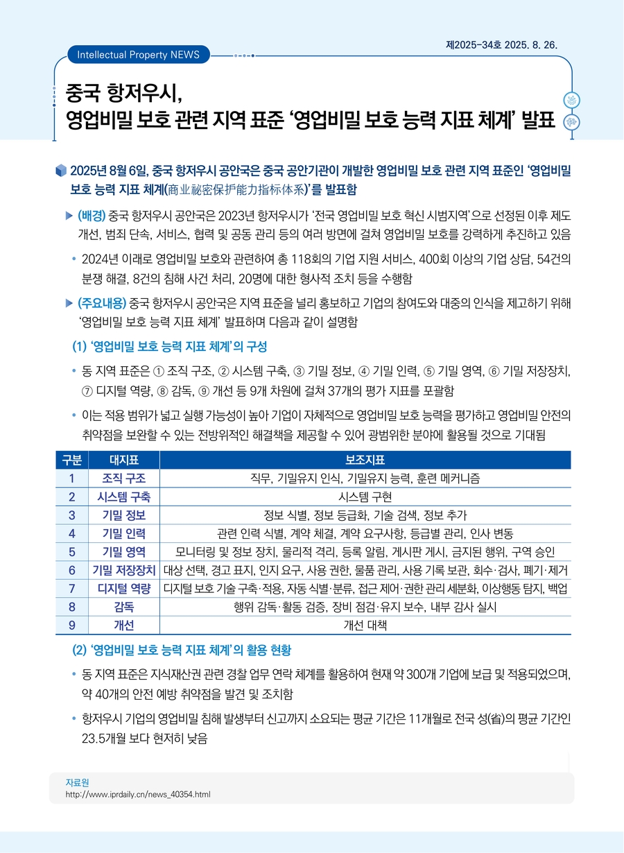 | 중국 항저우시, 영업비밀 보호 관련 지역 표준 ‘영업비밀 보호 능력 지표 체계’ 발표 |