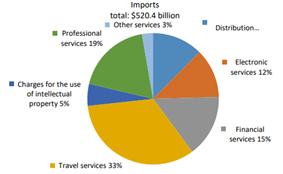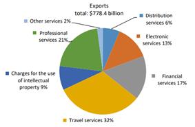 - (개요) 동 보고서는 서비스 분야의 미국 무역에 대한 전체적인 개관을 설명하고 시장 상황, 무역 동향, 물류 서비스, 해양 서비스, 소매 서비스, 프랜차이즈 서비스 업계 전망에 대해 논의함 - (주요내용) 동 보고서에서 미국은 2017년도 세계 최대의 서비스 수출국이자 수입국으로 서비스 수출은 총 7,884억 달러였고 수입은 총 5,204억 달러로 단일 국가 수출 점유율 1위를 차지함 ∙ 2017년 총 서비스 무역 수출액은 전 세계 수출액의 15%를 차지하며 이는 2위인 영국 수출액의 2배 이상에 해당함 ∙ 미국의 서비스 수출의 경우 2018년 예비조사에서 3.4% 증가한 총 8,057억 달러이며 수입은 5,443억 달러로 4.3% 증가함 ∙ 서비스 산업의 무역에서 지식재산권이 활용된 경우는 전체 수출에서 9%(697억 달러)를 차지하였으며, 수입의 경우에는 5%(281억 달러)를 차지함