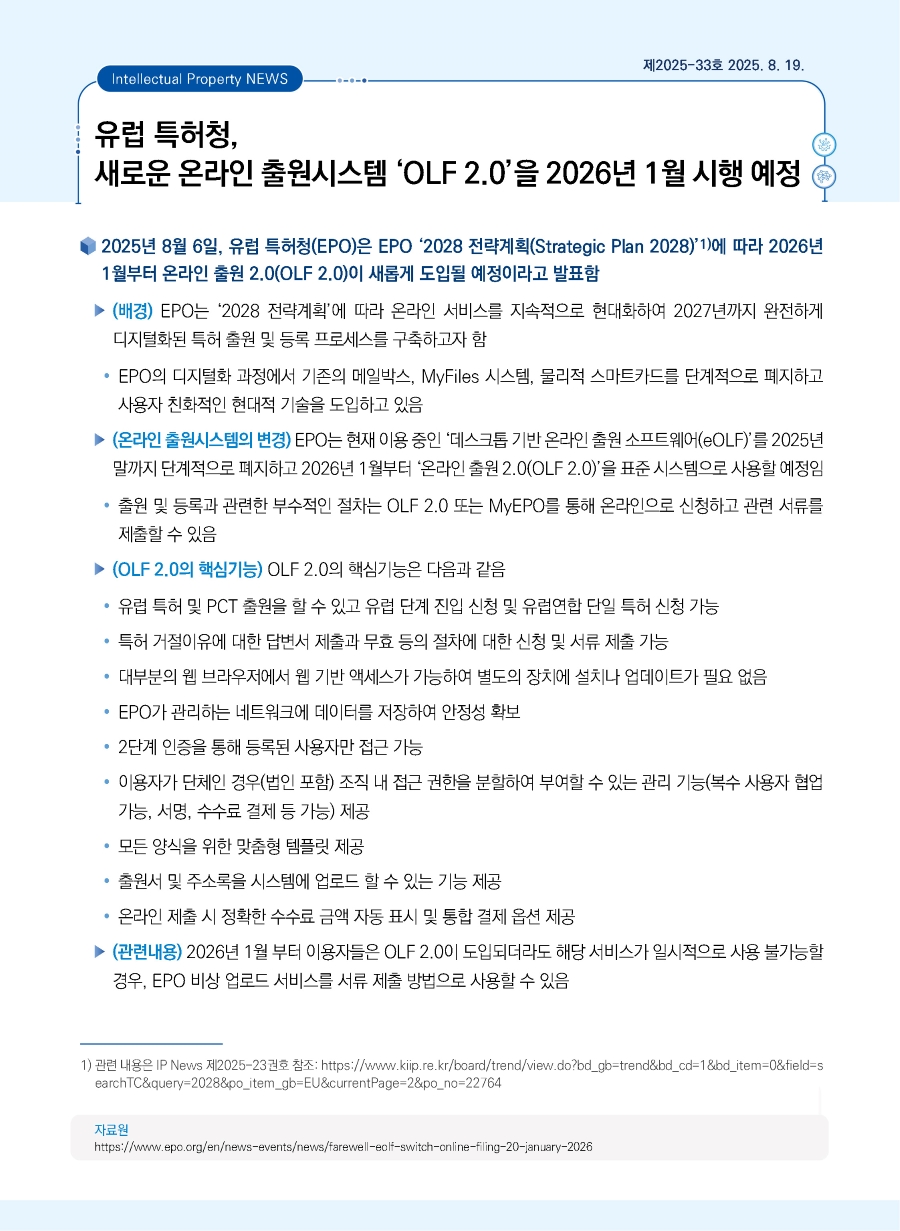 | 유럽 특허청, 새로운 온라인 출원시스템인 ‘OLF 2.0’을 2026년 1월 시행 계획 발표 |