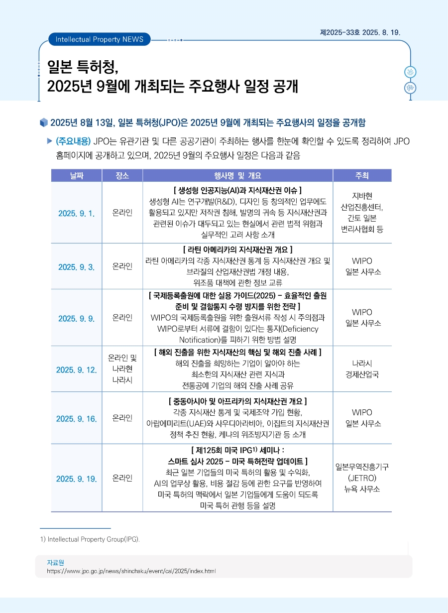 | 일본 특허청, 2025년 9월에 개최되는 주요행사 일정 공개 |