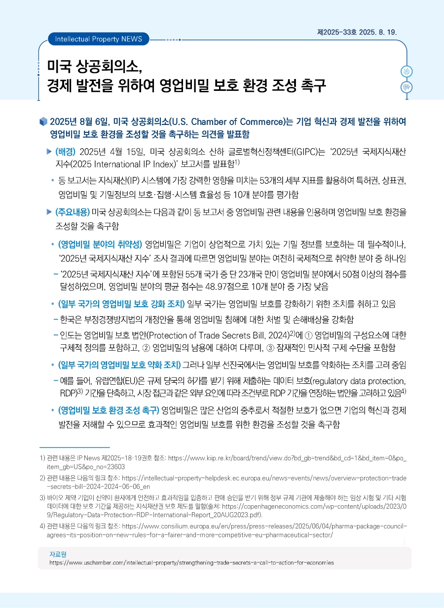 | 미국 상공회의소, 경제 발전을 위하여 영업비밀 보호 환경 조성 촉구 |