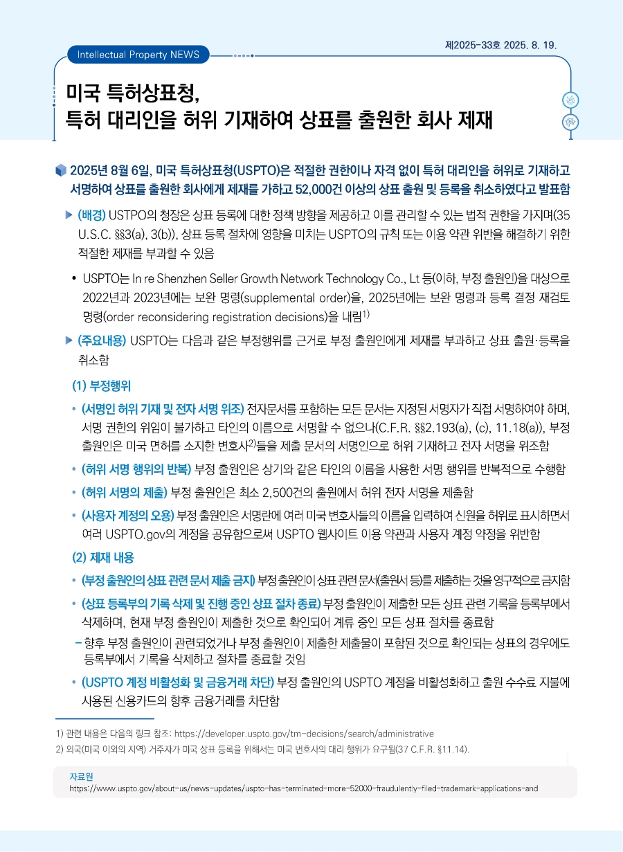 | 미국 특허상표청, 특허 대리인을 허위 기재하여 상표를 출원한 회사 제재 |