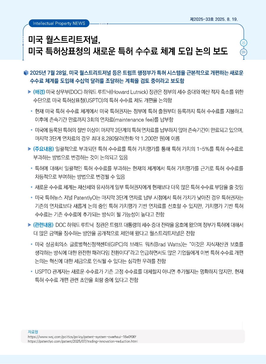 | 미국 월스트리트저널, 미국 특허상표청의 새로운 특허 수수료 체계 도입 논의 보도 |