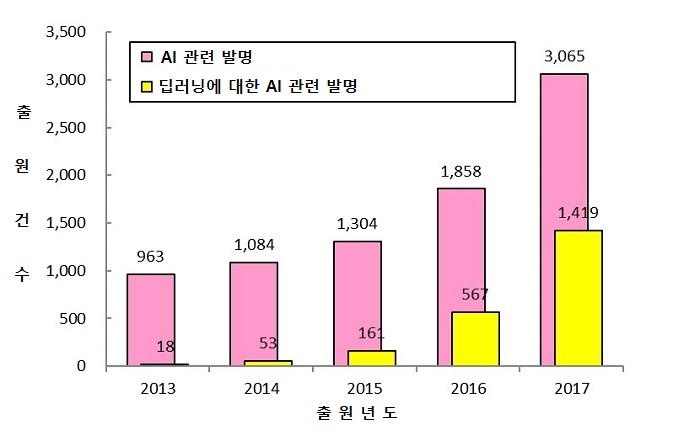 - (배경) 최근 딥러닝(deep learning)을 중심으로 한 AI 기술의 발전과 함께, AI 관련 발명의 특허 출원에 대한 관심이 높아지고 있음 ∙ 이에 경제산업성과 일본 특허청(JPO)은 AI의 핵심 기술에 대한 발명(국제 특허분류 G06N)은 물론 AI를 각 기술 분야에 적용한 발명을 ‘AI 관련 발명’에 포함하여 일본 및 해외의 출원 현황을 조사함 - (주요내용) 동 조사 결과의 주요 내용은 다음과 같음 ∙ (출원건수) AI 관련 발명의 출원 건수는 2014년 이후 급증하고 있으며, 신경망을 포함한 머신러닝(machine learning) 기술 및 딥러닝에 대한 발명이 그 증가세를 주도하고 있음 ∙ (적용대상) AI를 이미지 처리 및 정보 검색 분야에서 적용하는 기술에서 출원 건수가 많이 나타나고 있으며, AI를 제어·로봇 관련 분야에 적용하는 기술에서 출원의 증가율을 높게 나타나고 있음 ∙ (해외동향) 국제특허분류(IPC) G06N이 부여된 AI 관련 출원은 각국에서 증가하는 추세를 나타내고 있는 가운데, 미국과 중국의 출원 건수가 특히 높게 나타나고 있음