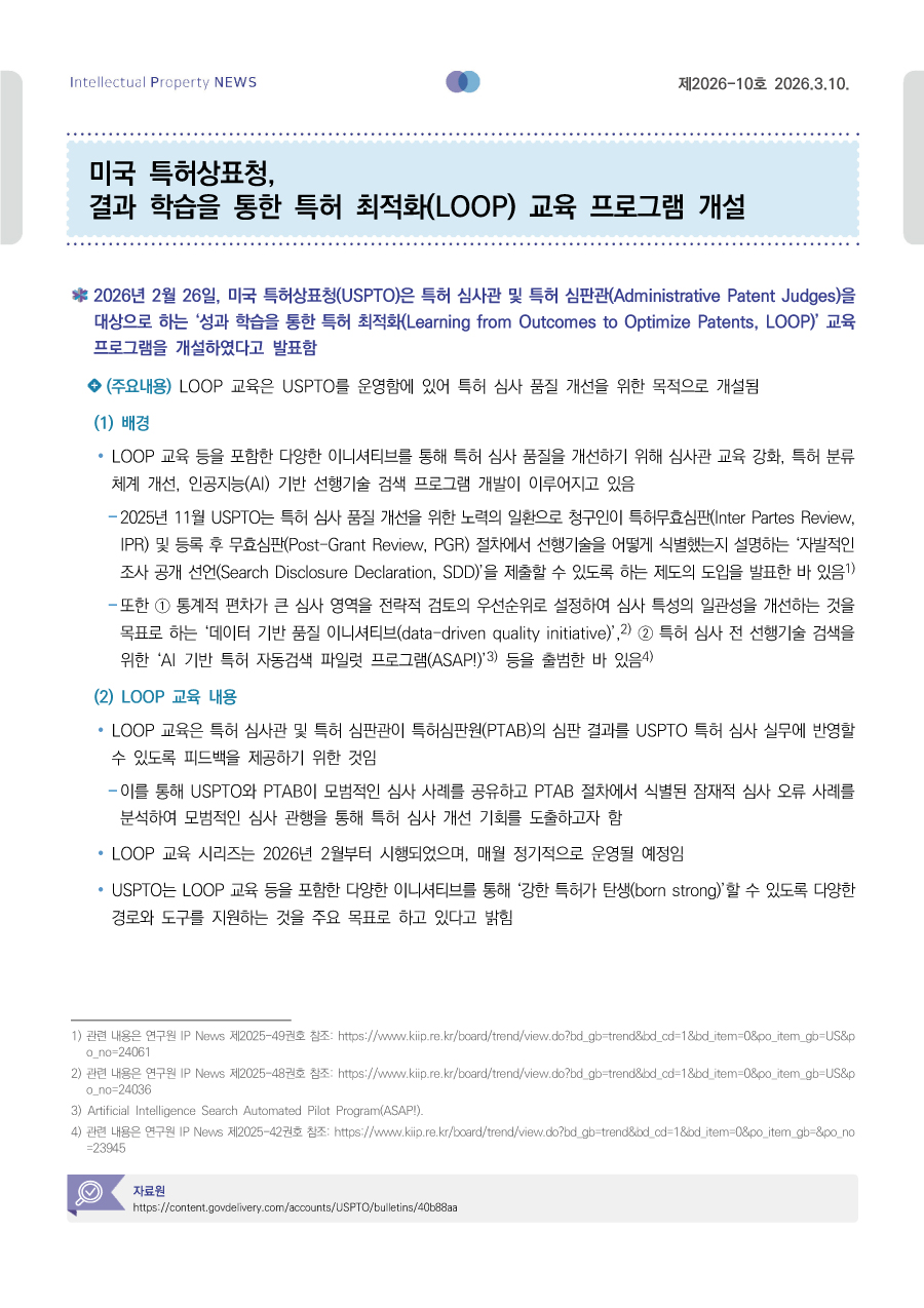 미국 특허상표청, 결과 학습을 통한 특허 최적화(LOOP) 교육 프로그램 개설