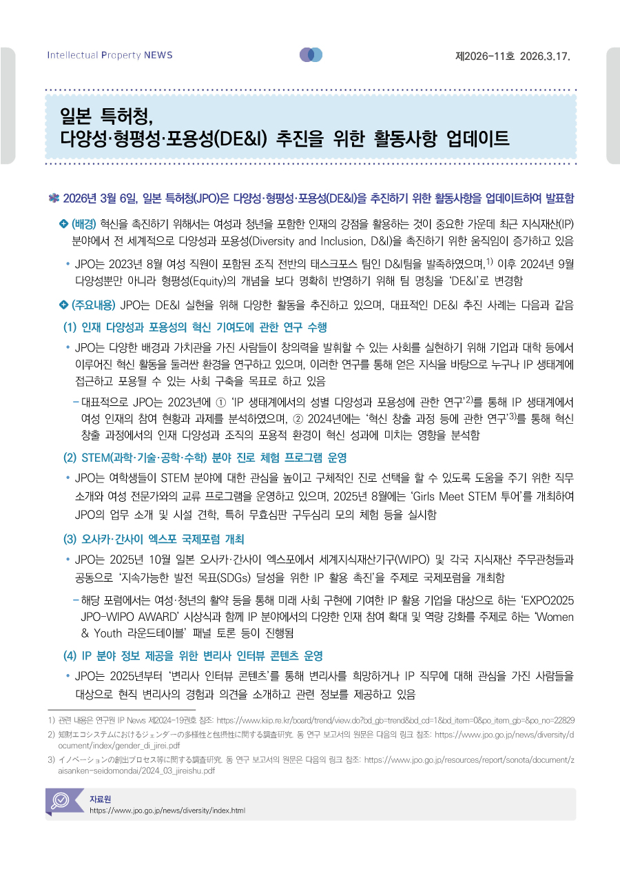 일본 특허청, 다양성·형평성·포용성(DE&I) 추진을 위한 활동사항 업데이트