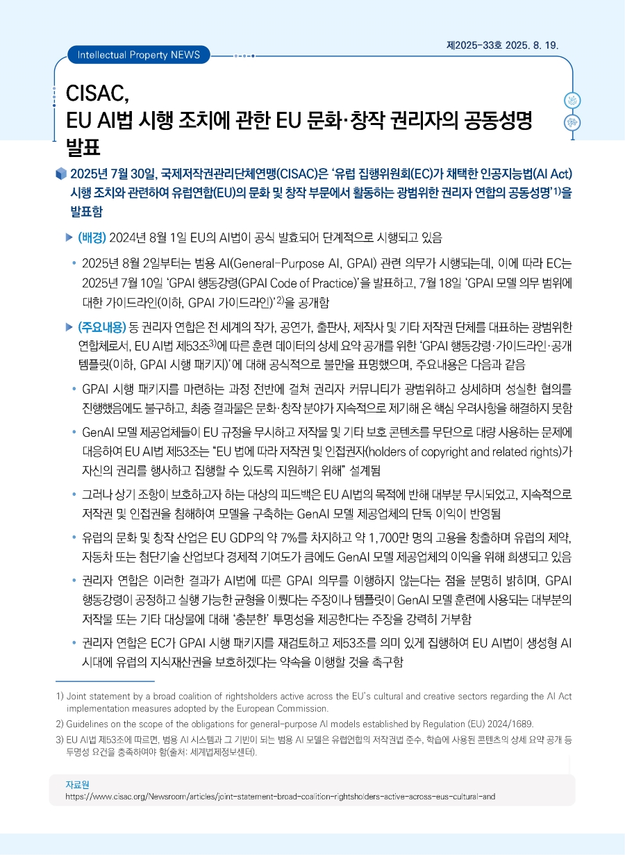 | CISAC, EU AI법 시행 조치에 관한 EU 문화·창작 권리자의 공동성명 발표 |