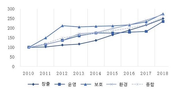 - (배경) CNIPA 지식재산권발전연구센터(知识产权发展研究中心)는 매년 전국의 지식재산권 발전현황을 조사하여 보고서로 발표해 옴 ∙ 동 보고서는 지식재산권 창출·활용·보호·환경의 4개 분야에 대한 전국 및 각 성(省)급 지역의 발전현황을 전반적으로 평가·분석함 ∙ 또한 과학기술 자원 투자 및 지식재산권 창출수준이 비교적 높은 40개 국가의 지식재산권 능력, 성적, 환경 등 항목에 대한 국제비교를 수행함 - (주요내용) 이번 조사결과에 따르면, 지식재산권 종합 발전지수는 257.4점으로 전년대비 17.9%가 증가함 ∙ 항목별 지수는 창출부분 249.3점(15.2%), 운영부분 234.8점(28.5%), 보호부분 274.3점(17.8%), 환경부분 271.3점(12.5%)으로 모두 전년대비 상승함 ∙ 2018년 지수 중 지식재산권 운영부분의 성과가 급격한 증가율을 보임 ∙ 지식재산권 종합지수가 높은 상위 5개 지역은 광둥성(86.46점), 장쑤성(85.08점), 베이징(84.5점), 상하이(83.92점), 산둥성(81.01점) 순임 ∙ 국제 비교의 측면에서는 2017년 전체 13위에서 2018년 8위로 순위 상승을 기록함 ∙ 한편 동 보고서는 2018년 종합지수에 비추어볼 때 중국 지식재산권 창출 품질의 향상이 요구된다고 지적하였으며, 지역적 불균형 해소와 제도, 시장, 문화 등 지식재산 환경의 개선이 필요하다고 언급함