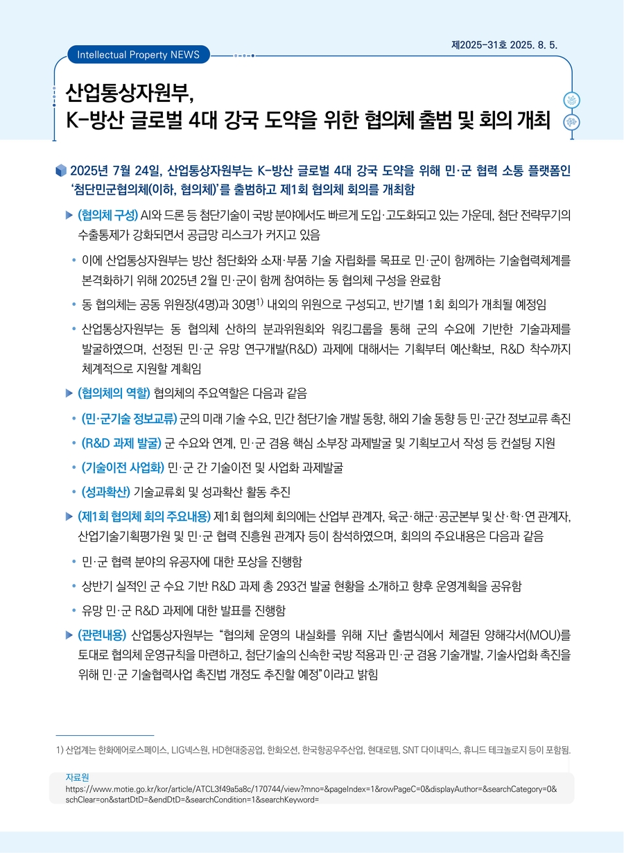 | 산업통상자원부, K-방산 글로벌 4대 강국 도약을 위한 협의체 출범 및 회의 개최 |