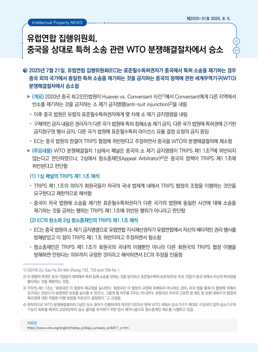 | 유럽연합 집행위원회, 중국을 상대로 특허 소송 관련 WTO 분쟁해결절차에서 승소 |