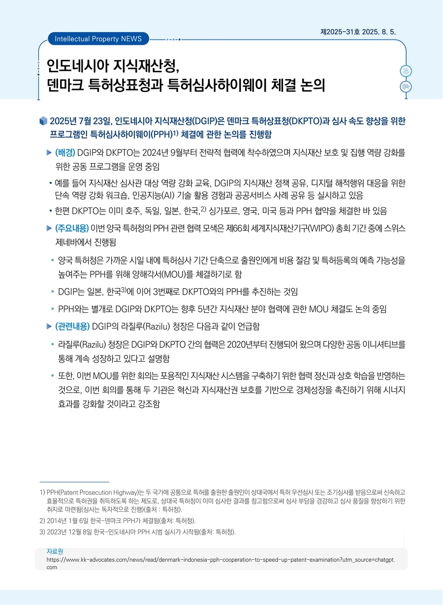 | 인도네시아 지식재산청, 덴마크 특허상표청과 특허심사하이웨이 체결 논의 |