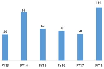 - (배경) 2016년 4월, 미국 발명법(AIA)의 시행 이후 약 3년 반 동안 1,500건의 심판절차를 진행한 결과, PTAB은 보정 신청에 관한 연구를 실시하였으며 동 연구의 세부내용은 다음과 같음 ∙ ① 회계연도 기준, 심판에서의 총 보정 신청 건수, ② 각각 보정 신청에 대한 경과, ③ 대체 청구항(substitute claim)의 승인, 일부 승인, 일부 거절, 거절 건수, ④ PATB 의 대체 청구항 거절 사유 ∙ PTAB은 보정 신청에 관한 데이터를 계속적으로 수집하고 있으며 이번 통계연구는 2018년 9월(회계연도 2018년 말)까지 진행된 보정 신청에 관한 결과임 - (주요내용) 2012년 10월 1일부터 2018년 9월 30일까지 PTAB에 신청한 심판건수는 총 4,269건으로 이 중에서 326건(약 8%)에 대해 보정 신청이 이루어짐 ∙ 동 기간 동안 이루어진 보정 신청에 대한 승인 건수는 총 205건이며, 전체 326건의 보정 신청 중 약 63%를 차지함 ∙ 동 기간 동안 승인된 보정신청 중에서 대체 청구항이 승인된 건수는 8건(4%), 일부 승인은 13건(6%), 거절된 건수는 184건(90%)이었음 ∙ 대체 청구항이 거절된 사유에서 절차적 사유가 11%, 법적 사유가 전체의 89%를 차지하였고, 법적 사유 중에서 신규성(§102) 및 진보성(§103)에 관한 사유로 거절된 건수가 45%를 차지함 ∙ 회계연도 기준 보정 신청 건수는 2013년 49건, 2014년 92건, 2015년 60건, 2016년 56건, 2017년 50건, 2018년 114건으로 아래의 그림 참조