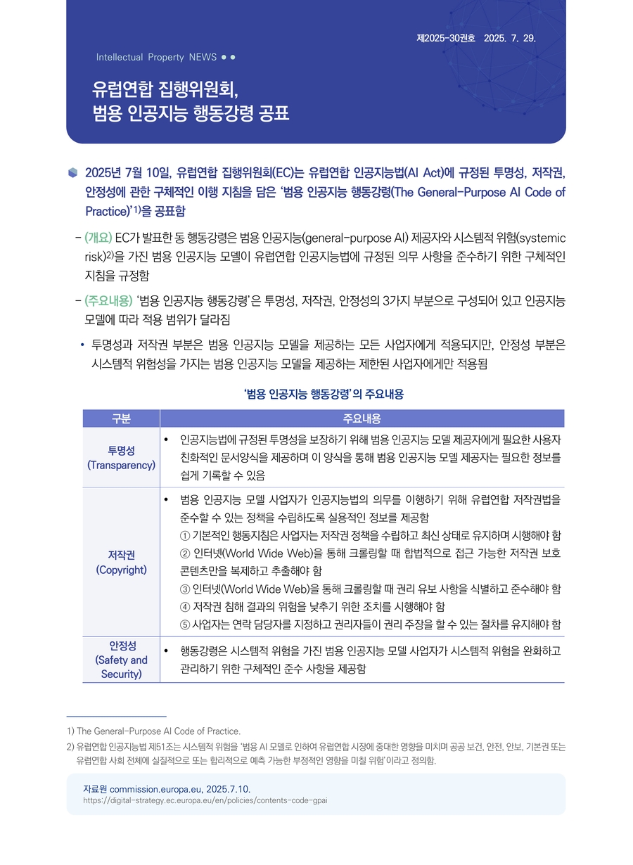 | 유럽연합 집행위원회, 범용 인공지능 행동강령 공표 |